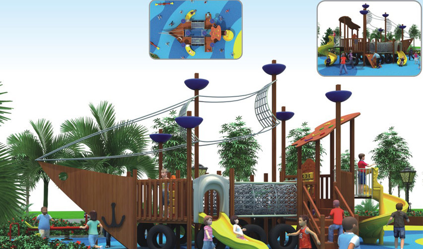 木質組合滑梯,海盜船造型?;?、旋轉滑梯、網籠組合,色彩鮮艷,造型深受兒童喜歡。適合公園、兒童樂園等場所。