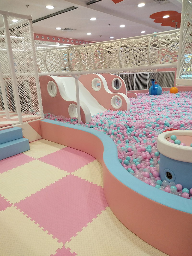 海洋球池上空有縱橫交錯的網繩圈,孩子們可以穿行其中,特別鍛煉孩子們的膽量。