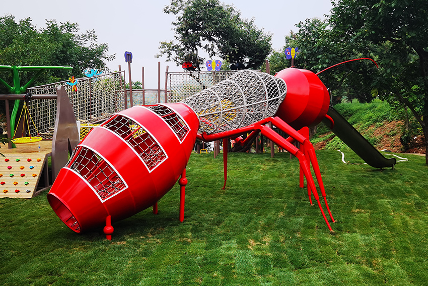 紅螞蟻造型的爬網與滑梯的組合,在場地里特別醒目。