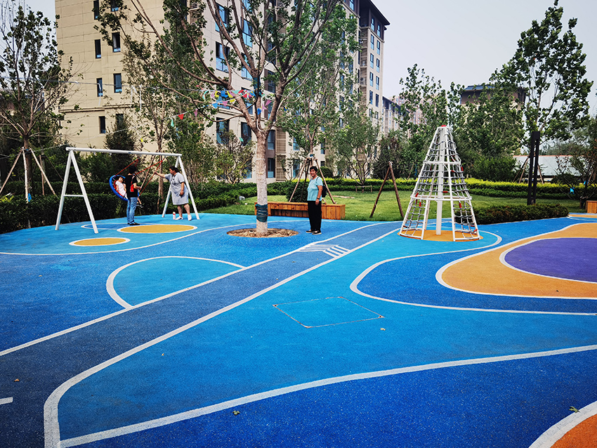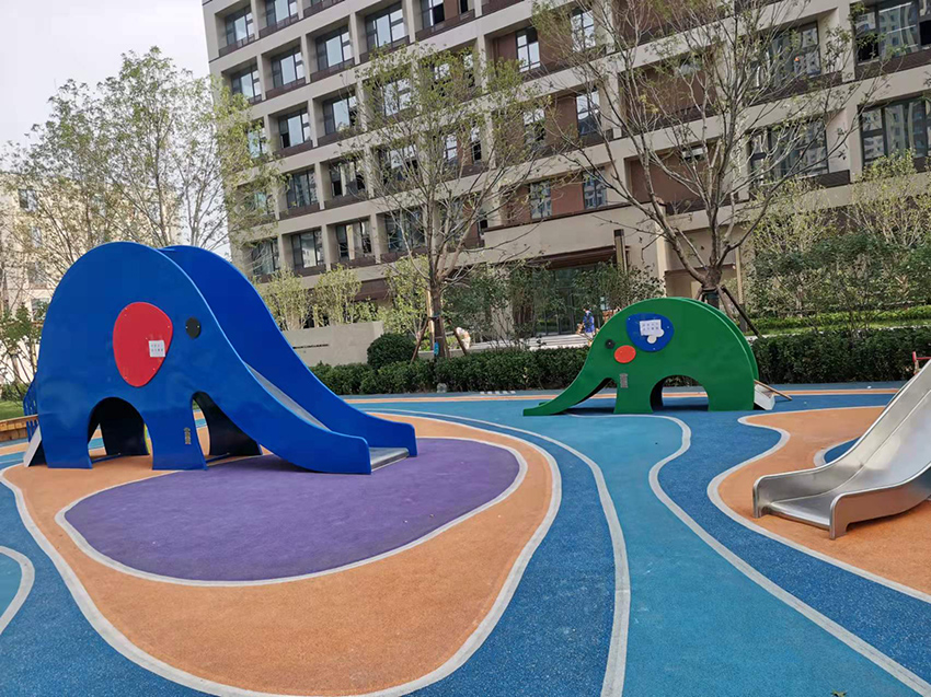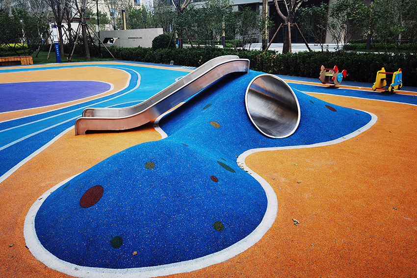 北京亦莊首創遠洋禧瑞天著社區的主題樂園位于社區內的中心廣場,廣場采用橡膠地面,擁有微地形樂園,可以讓孩子鉆爬,也有滑滑梯,還有動物造型的小滑梯,秋千架,攀爬架等,可以讓孩子們自有玩耍。